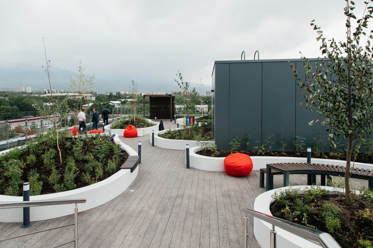 На всей территории общежития доступен wi-fi. В рамках благоустройства и озеленения высажено свыше 100 кустарников и деревьев, созданы workout-зоны. На крыше общежития для отдыха студентов обустроена зеленая терраса площадью 400 квадратных метров с панорамным видом на город и предгорье Заилийского Алатау.