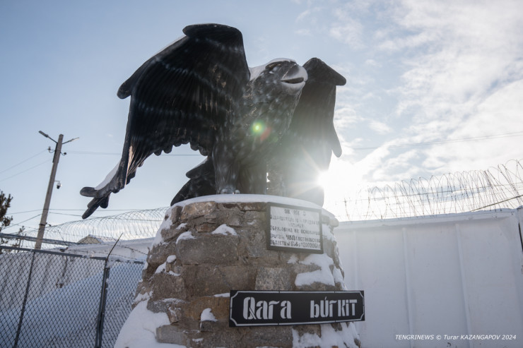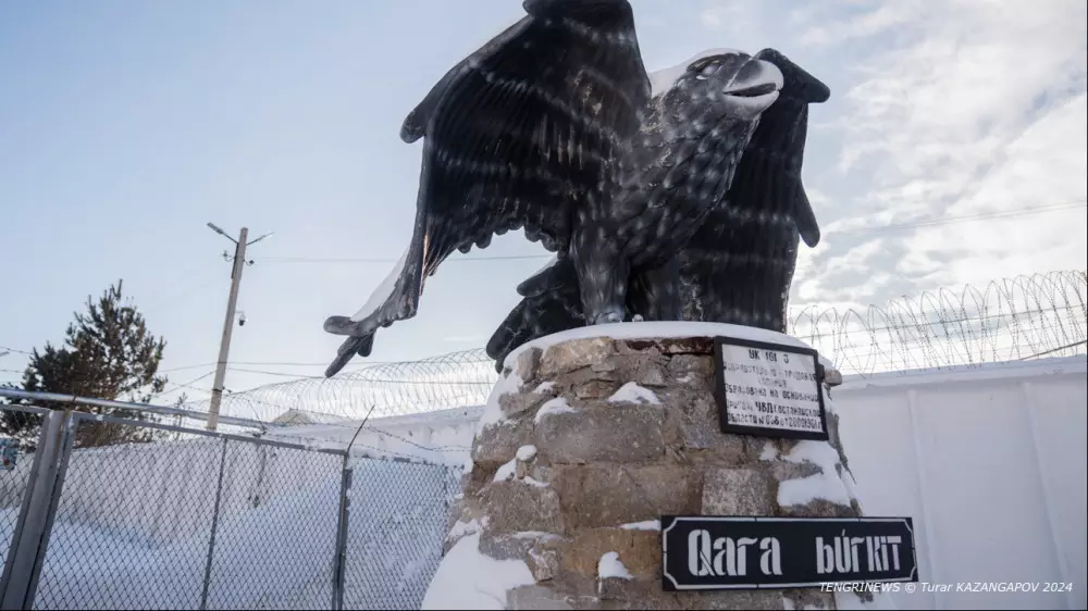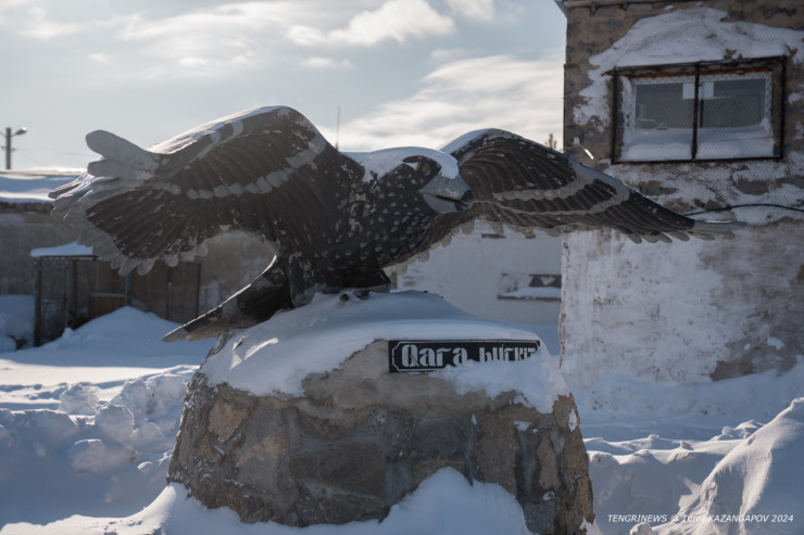 У входа в учреждение красуется большая статуя распахнувшего крылья беркута. Здесь таких две. Вторая расположена уже на территории колонии за высоким забором.