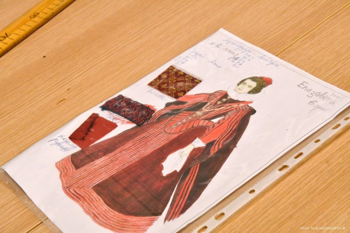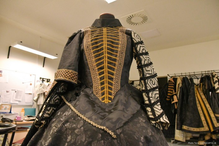 "Ткани мы закупали в разных местах. Что-то здесь, что-то в Алматы. Какие-то ткани у нас из Турции, Москвы, что-то из Италии. Вся сложность найти такие материалы. Потому что сейчас никто не будет шить себе наряд, к примеру, из жаккардовой ткани. У нас очень много фактурных тканей, так как спектакль представлен в темных тонах. Очень много черных тканей, поэтому, помимо отделки, мы решили сделать акценты на фактуре ткани. У нас даже подклады фактурные", - отмечает Софья Тасмагамбетова.