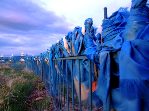 Монголы - суеверный народ. Каждые пять километров нам встречался священный холм из камней "Ово". У холма монголы общаются с небом, просят хорошей дороги или благодарят, оставляя здесь же тугрики, еду или одежду. Однако чаще всего место повязывают хадагом - синей лентой, самым распространенным видом талисмана и украшения в Монголии.