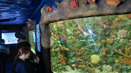 Новая зона представляет собой два огромных аквариума на 6 и на 10 тонн воды соответственно. Внутри них с точностью воссоздано подножие стенки кораллового рифа, где встречаются как придонные рыбы, так и обитатели глубин океанов.