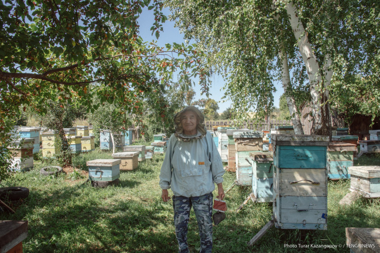 Отметим, что условия съемки близки к экстремальным. В то время как Мубарак Рахимбаевич в защитном костюме, наш фотограф ходит между ульями в штанах и футболке.