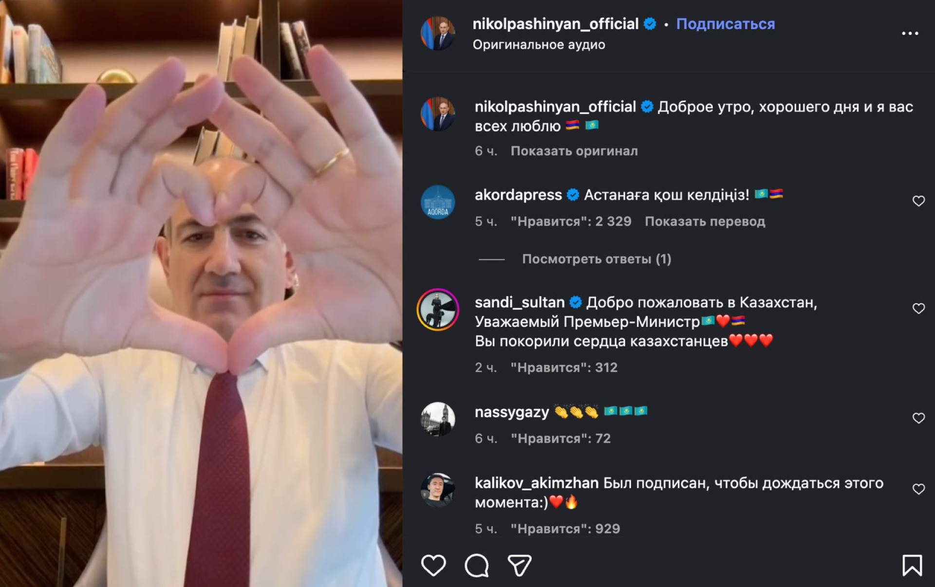 Утро премьера Армении в Астане началось с ритуала, который его подписчики знают наизусть: короткое видео в Instagram, музыка и жест. Только на этот раз — не меланхоличный вайб под Земфиру, а энергичная казахская песня и сердце, сложенное пальцами. Такое вот дипломатическое "доброе утро".