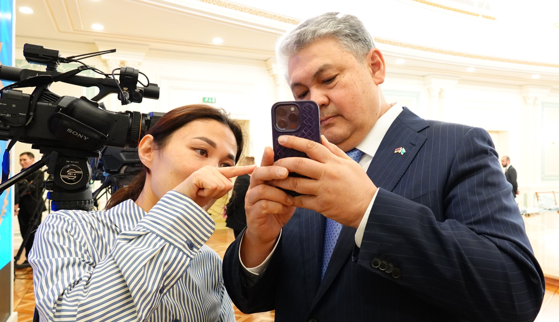 Ермек Кошербаев демонстрирует навыки фотографирования на смартфоне коллеги