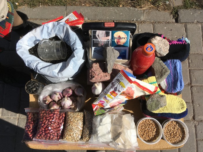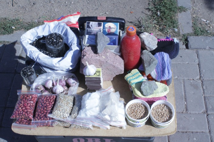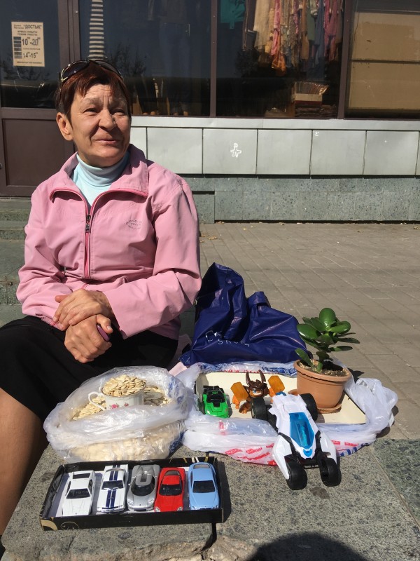 Тыквенные семечки, трансформеры, маленькая коллекция машинок и цветок - это ассортимент, которым торгует Светлана. "Стакан тыквенных семечек - 100 тенге, они очень полезные, их как лекарство можно использовать. А игрушки мне приносят продать, например, где-то у кого-то от внуков остались. Вот, например, трансформер бабушка одна дала продать", - поясняет женщина. Ей 52 года. Сама работает техничкой (два дня работает, два - отдыхает), получая 50 тысяч тенге, а в свободное время, как она сама говорит, она "реализатор".