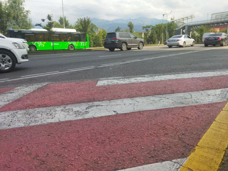 На одном из участков Абая, недалеко от пересечения с улицей Тлендиева, мы наглядно увидели, что асфальт по краям дороги крошится и шелушится. На автобусной полосе даже видны колеи. Местами попадаются небольшие ямки. Дорогу последний раз ремонтировали более 10 лет назад, хотя по стандартам должны были производить эти работы каждые пять лет.