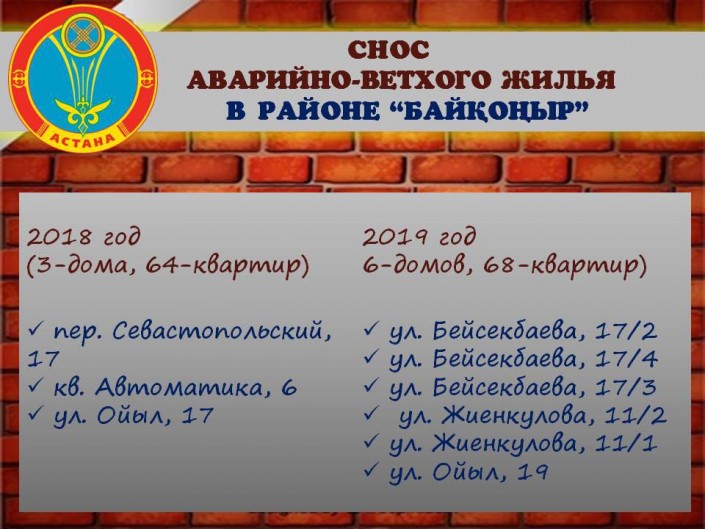 Кстати, на странице акима района Байконур в июле этого года был опубликован список домов в Астане, которые подлежат сносу с 2018 по 2022 год. В нем действительно есть информация, что снос 17-го дома в Севастопольском переулке запланирован на этот год.