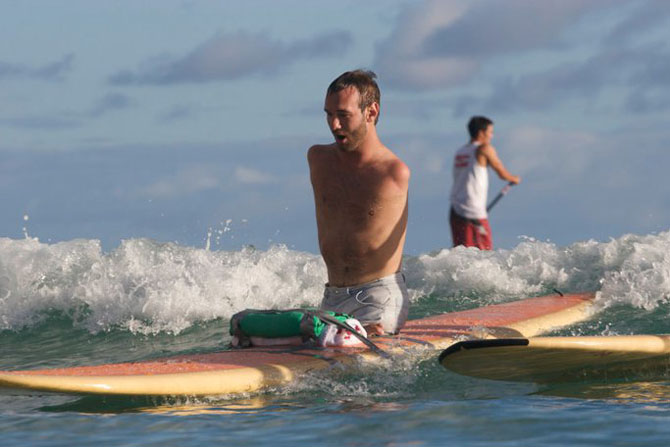 Вы его точно видели, хотя бы раз. И наверняка запомнили. Трудно забыть человека без рук и без ног, рассекающего по улицам на скейте. Или плавающего в океанариуме с акулами. Или в море - уже без акул, но на серфе.