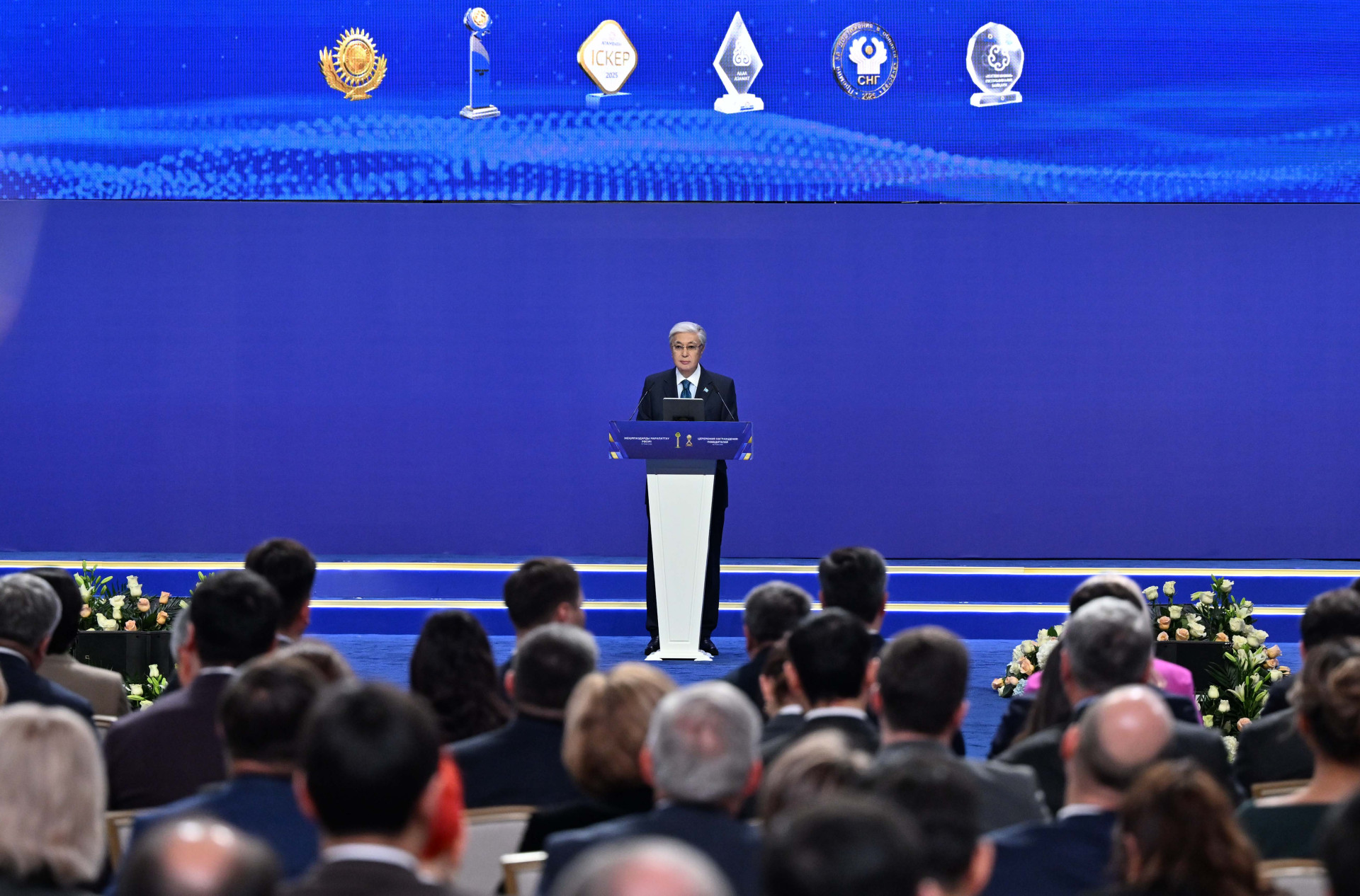 Касым-Жомарт Токаев делает небольшую паузу и смотрит в зал так, будто видит не только серьёзных людей и лакированные туфли, но и ту энергию, ради которой вообще собираются такие залы.