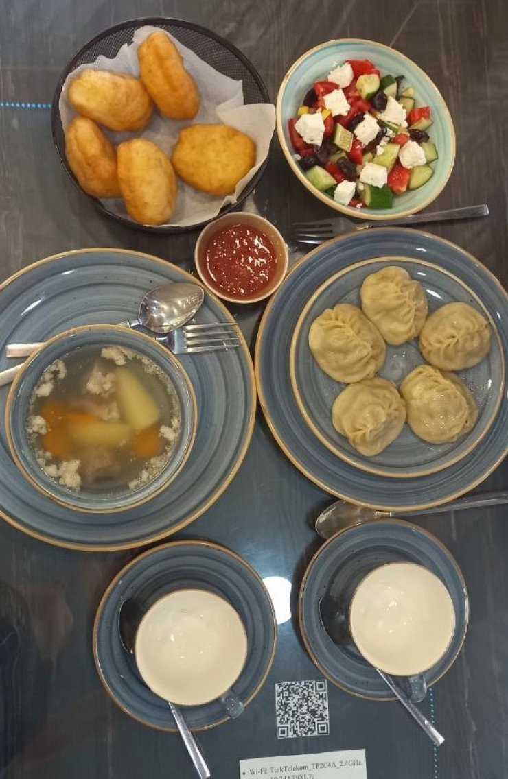 В процессе разговора мы заказали манты и сорпу по-казахски. Действительно, все очень вкусно, по-домашнему.