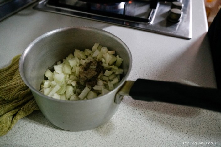 Одновременно нарезаем лук, перчим его, солим и откладываем эту смесь в сторону на несколько минут.