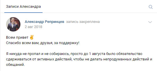 В социальных сетях Репринцев 2 августа прошлого года сделал запись.