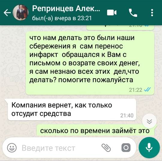 Не получив ответа на свое письмо, Бакыт повторно написал Репринцеву, уже в WhatsApp. Тот ему ответил, что компания вернет деньги, как только отсудит средства.