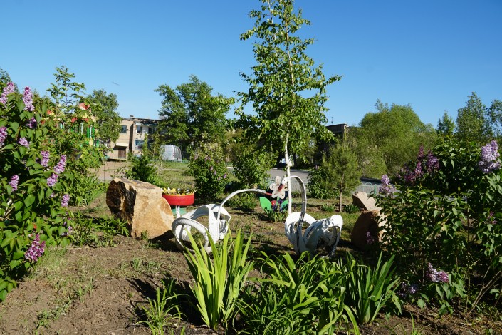 А тем временем во дворе Ольга Георгиевна Коняхина заботливо поливает свой оазис.