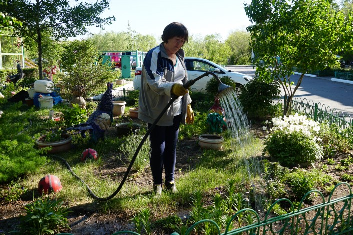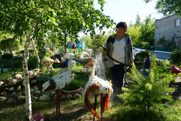 "Елку из Екатеринбурга привезли, осину с березами - с каньона, из Новоуральска - лилию, оттуда же, из леса, папоротник. Гортензию из Киргизии в чемодане привезла. Вот теперь все это растет, и за всем ухаживать надо", - отмечает женщина, поливая сад.