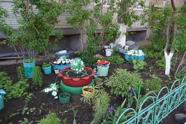 "По телевизору ее покажите, это самый лучший двор, похвалите ее, это все она делает", - говорит соседка, указывая на женщину, поливающую цветы в этом сказочном саду.