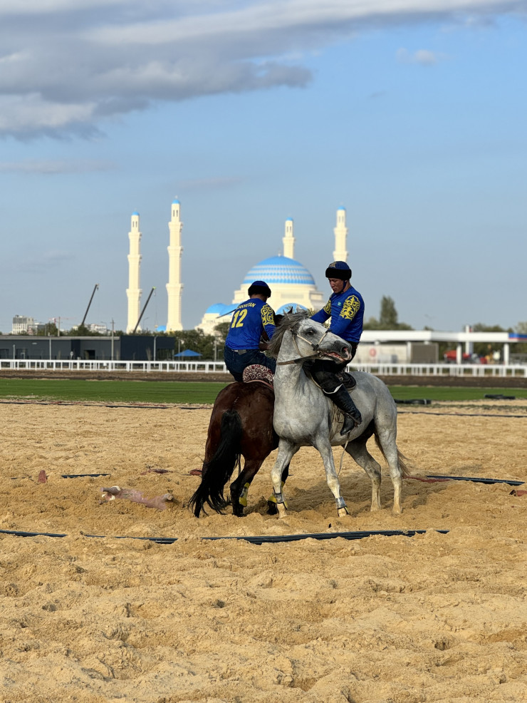 Внезапно появившаяся лошадь в попоне с изображением казахстанского флага привлекла к себе все внимание. К тренировке готовились игроки кокпара.