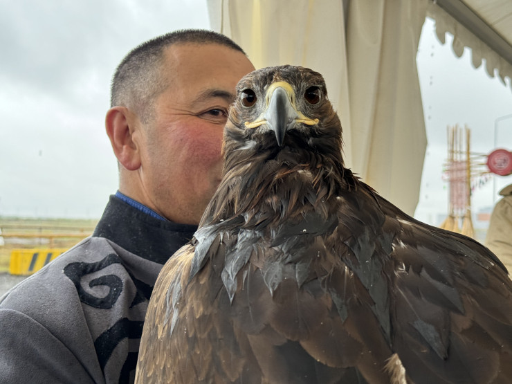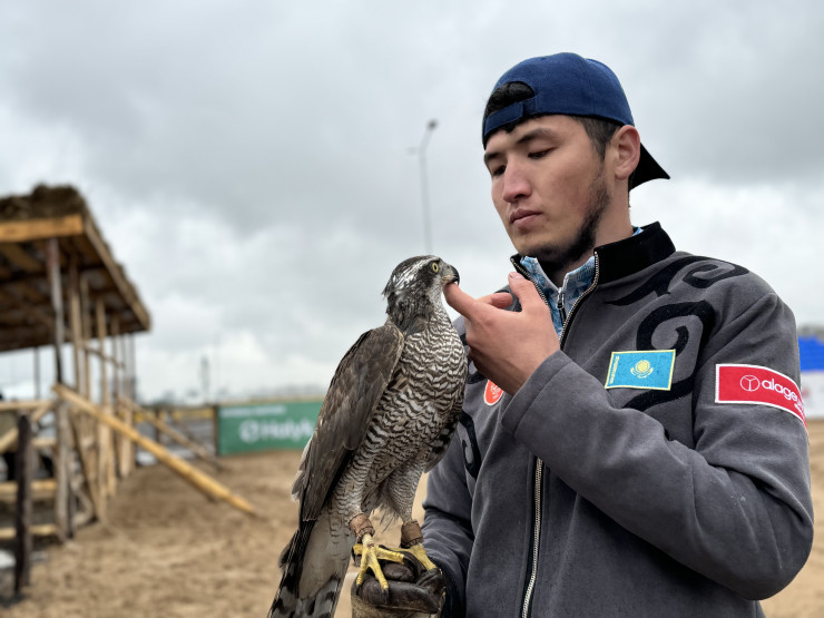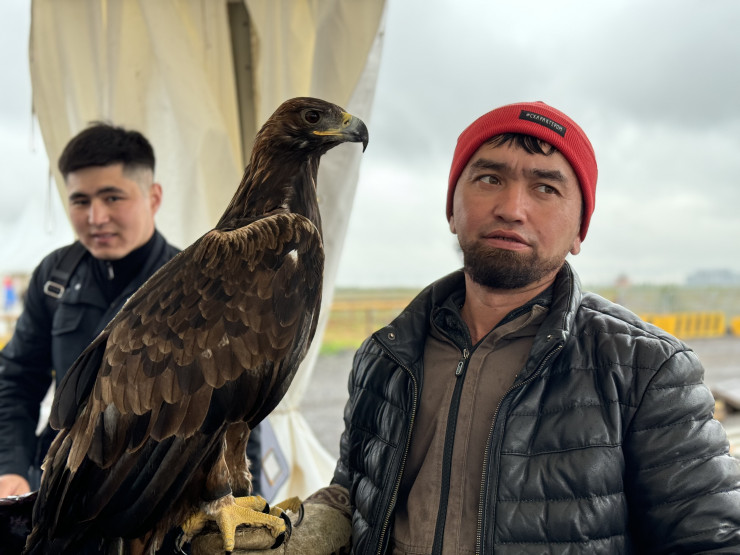 Ерзат Байкадамов из области Абай выступает со своей напарницей - беркутом по имени Зангар. Он занимается этим спортом уже восемь лет, примерно столько же, сколько лет его птице.