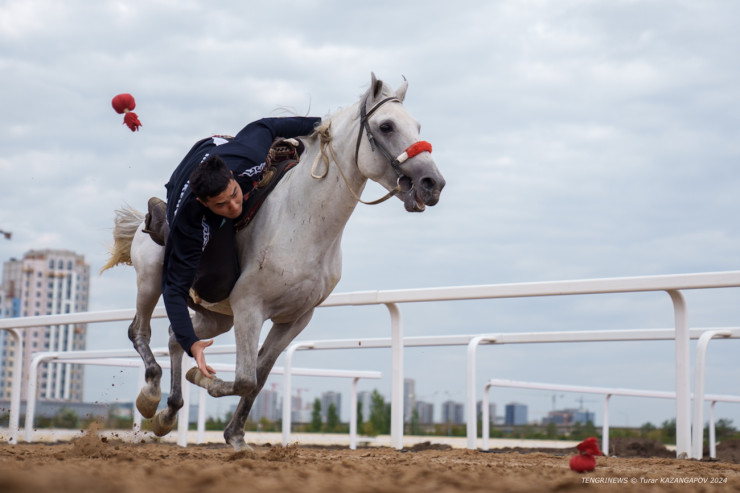 Еще один конный вид спорта - тенге илу. Цель этой игры - собрать как можно больше расставленных по земле мешочков с деньгами, при этом восседая на коне.