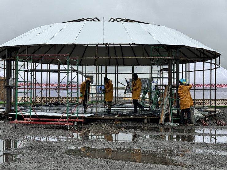 Неподалеку можно было заметить рабочих в ярких дождевиках, которые, несмотря на непогоду, собирали юрты и устанавливали декорации.