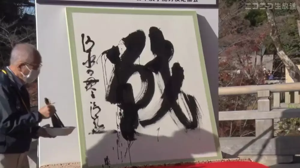 Главный священник всемирно известного буддийского храма Киемидзу-дэра в Киото Сейхан Мори нарисовал иероглиф большой каллиграфической кистью на огромном куске васи (японской бумаги). Этот иероглиф получил 10 804 голоса - больше всех среди более чем 223 000 работ, представленных публикой.