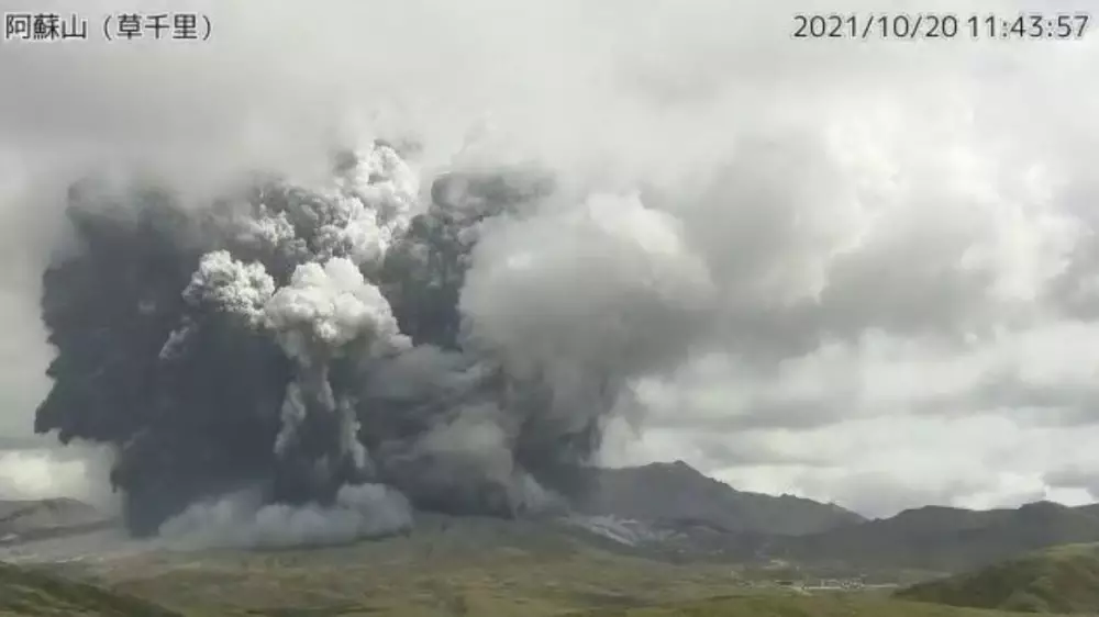 Mount Aso in Japan's Kyushu region has erupted. Smoke billowed out of the peak in Kumamoto Prefecture, starting at 11:43 a.m. on Wednesday. pic.twitter.com/n3YvBdnxkt