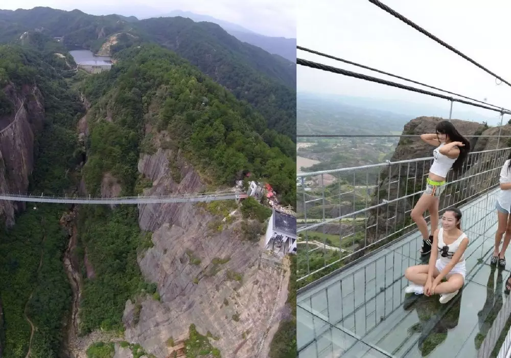 "Сама же конструкция моста является чрезвычайно прочной. Так, 430-метровый мост состоит из 99 трехслойных сверхпрочных панелей из стекла и способен выдержать вес 800 человек одновременно", отмечает телеканал "Звезда".
