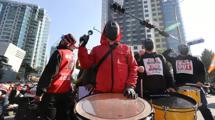Южнокорейские рабочие вышли на митинг в костюмах из "Игры в кальмара", передает Tengrinews.kz со ссылкой на Reuters.