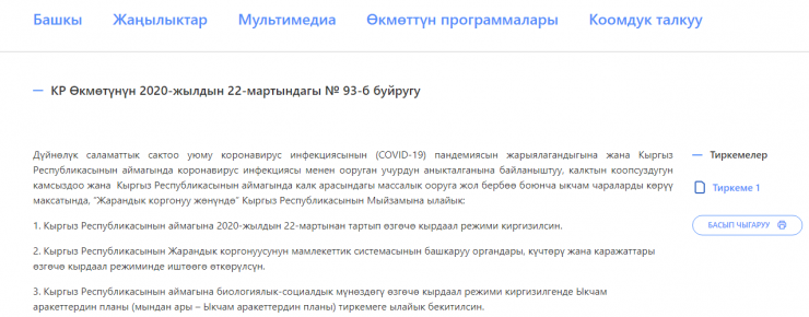 По ее данным, на официальном сайта правительства КР это распоряжение опубликовано на кыргызском языке: