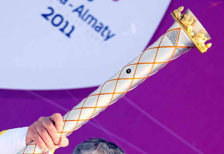 Фото Владимир Дмитриев© В Алматы стартовала эстафета огня Азиады Аким Алматы Ахметжан Есимов передал факел своему заместителю Серику Сейдуманову. В среднем факел каждый из участников будет проносить по 40 секунд.