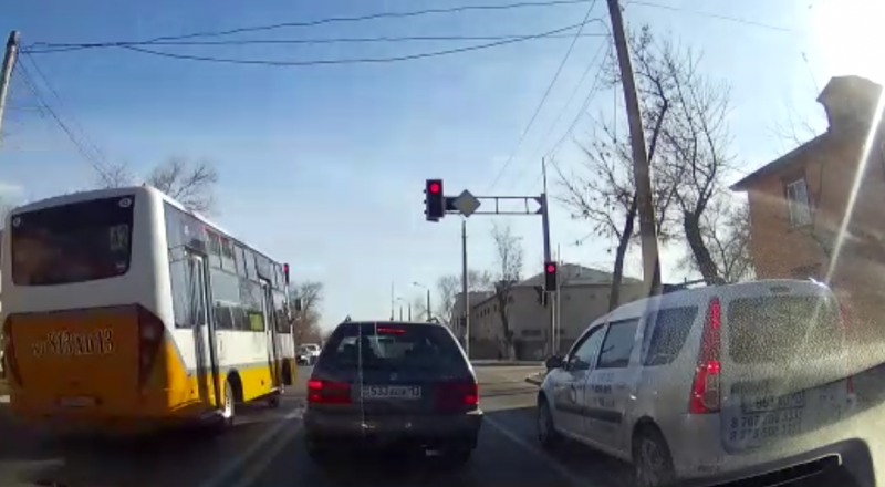 В Шымкенте автобус проехал на красный свет по встречной полосе Судя по дате на видеорегистраторе, ролик снят 10 января 2017 года.