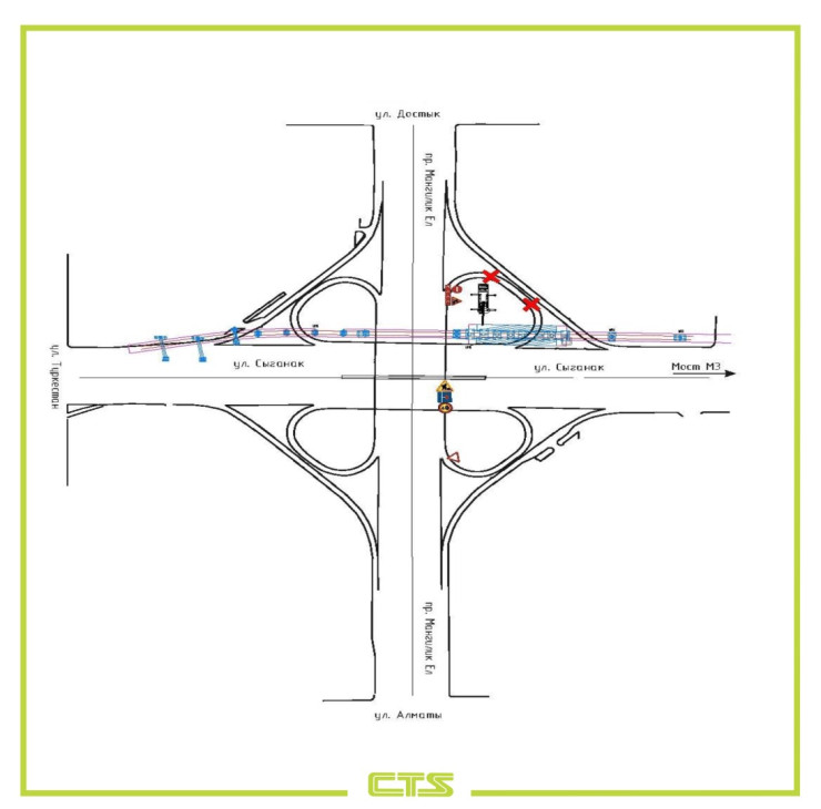 - с 21 марта по 31 декабря на транспортной развязке по типу "полный клевер" Сыганак/Мангилик Ел будет ограничено движение со стороны проспекта Мангилик Ел подъем на улице Сыганак для строительства станции 113.