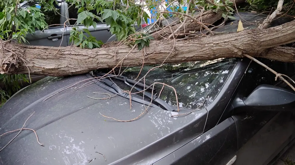 Звуки сработавшей автосигнализации услышали люди и вышли на улицу. Крона дерева накрыла сразу три автомобиля, которые были припаркованы на стоянке. Больше всего не повезло кроссоверу: на него упал ствол, подмяв под себя и крышу, и лобовое стекло.