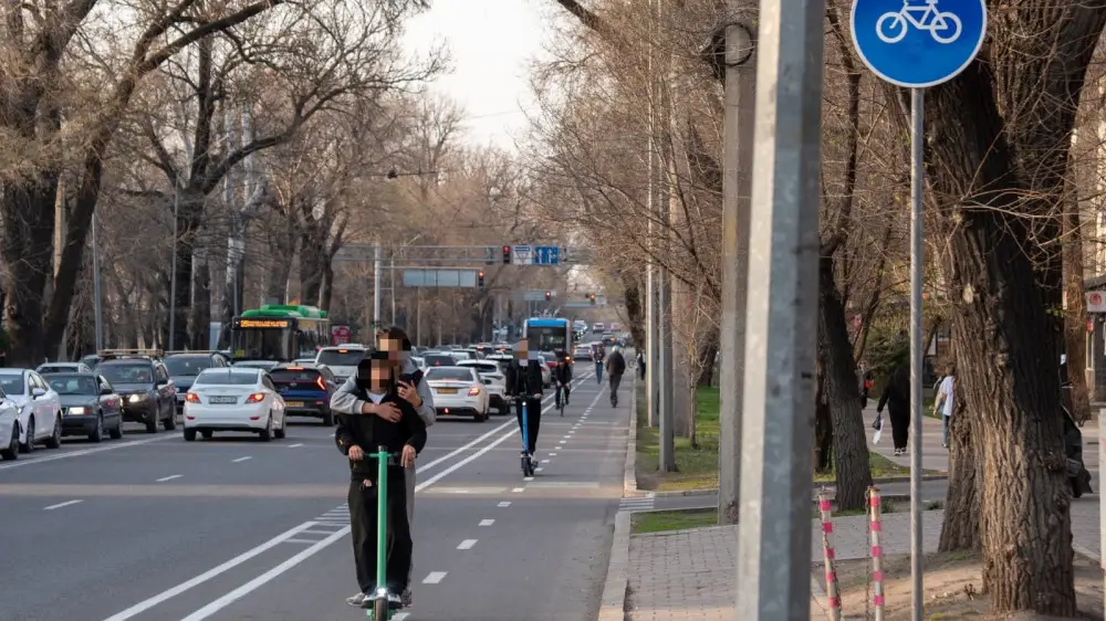 На этом участке также часто можно увидеть, как экономные алматинцы едут вдвоем на одном самокате.