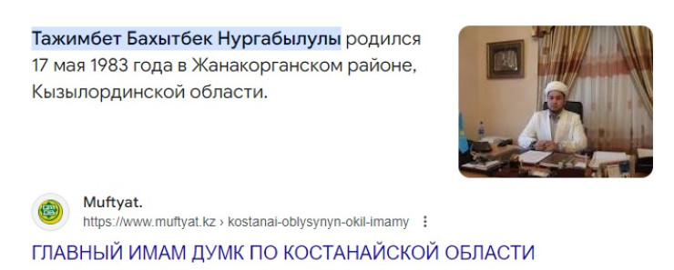 Судя по данным сайта муфтията, страница с биографией Бахытбека Тажимбета удалена.