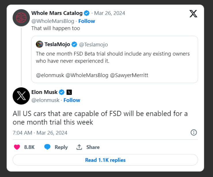 Согласно внутреннему документу Tesla, предполагается, что работники компании будут инсталлировать систему FSD в режиме пробной версии на автомобили и предлагать владельцам испытать нововведение во время коротких тестовых поездок. Это предложение распространяется как на новые, так и на старые модели машин, подтверждает Илон Маск через соцсеть X.
