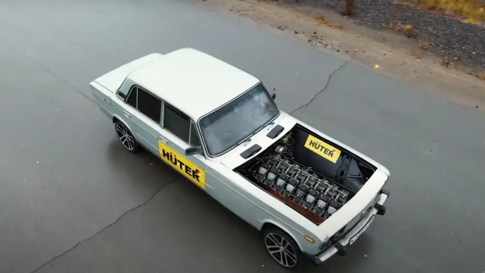 Команда "Гараж 54" установила V-16, сделанный из бензопил, в старый "жигули", передает Tengri Auto.