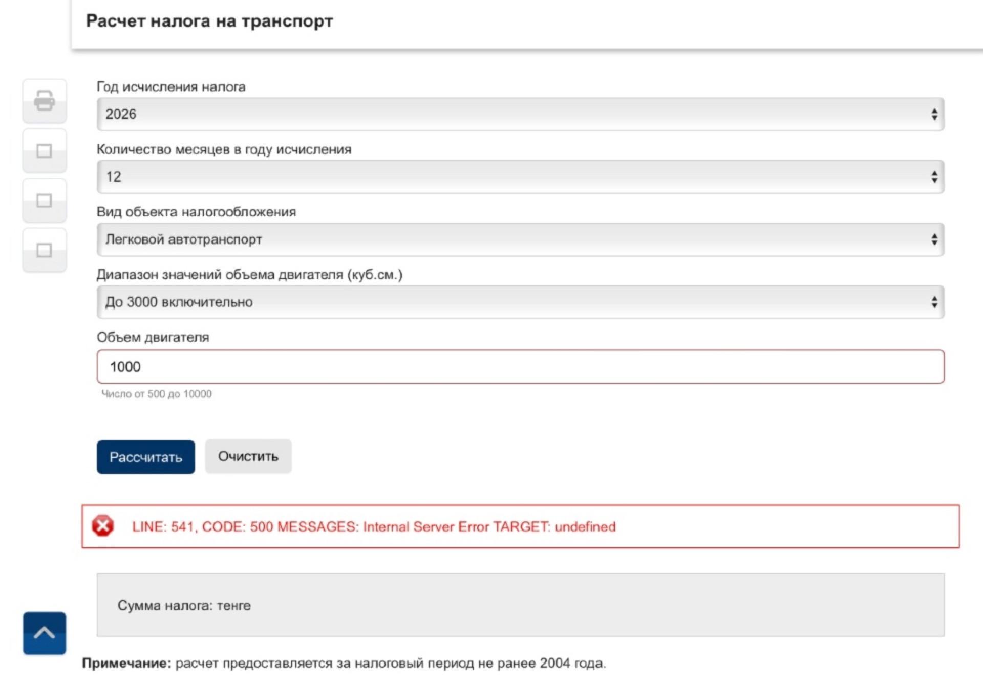 Однако при попытке воспользоваться онлайн-калькулятором на сайте КГД у него возникли сложности. По его словам, сервис не учитывает год выпуска автомобиля, а значит, не позволяет корректно применить понижающие коэффициенты и рассчитать итоговую сумму налога.