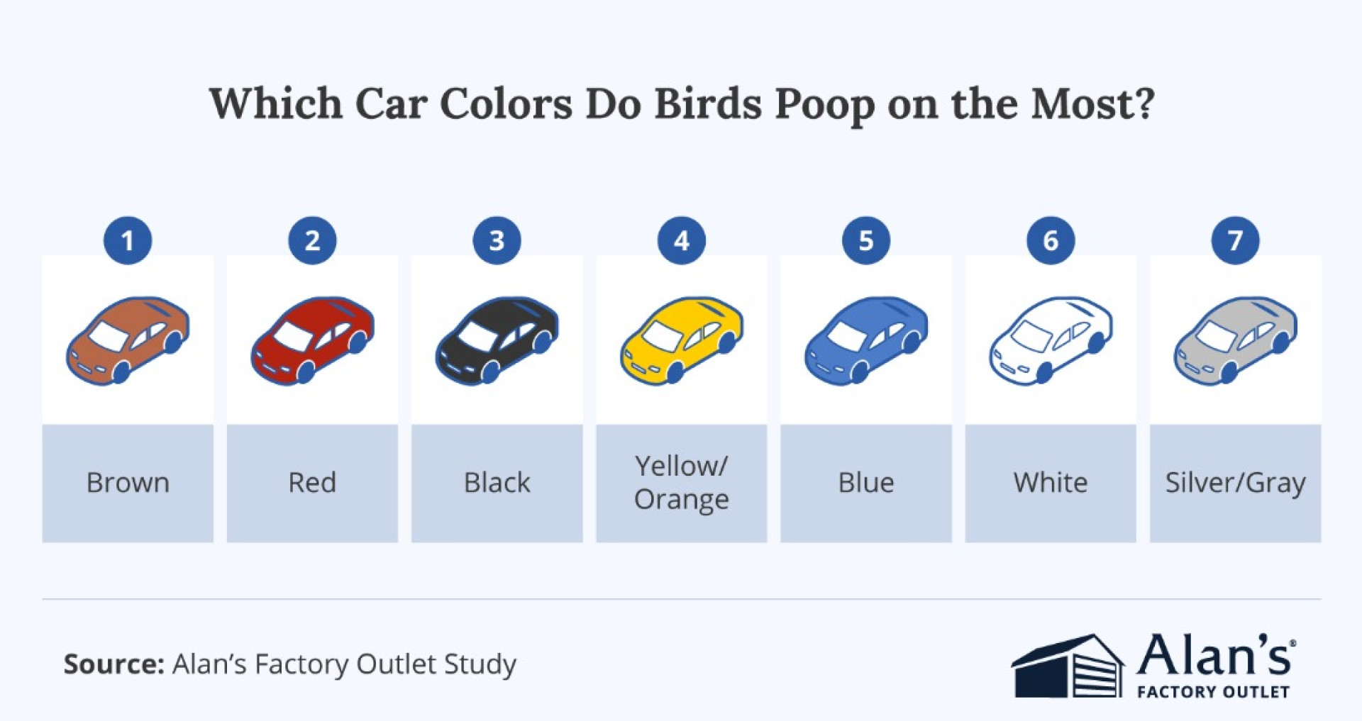 Американская компания Alan’s Factory Outlet опросила тысячу водителей, чтобы разобраться с неожиданной, но знакомой всем автолюбителям проблемой — птичьим пометом на автомобилях. Объединив результаты опроса с данными о поведении птиц и привычках парковки, исследователи выяснили, какие автомобили страдают чаще, какие цвета притягивают больше всего "неприятностей" и сколько денег уходит на уборку, передаёт Tengri Auto.
