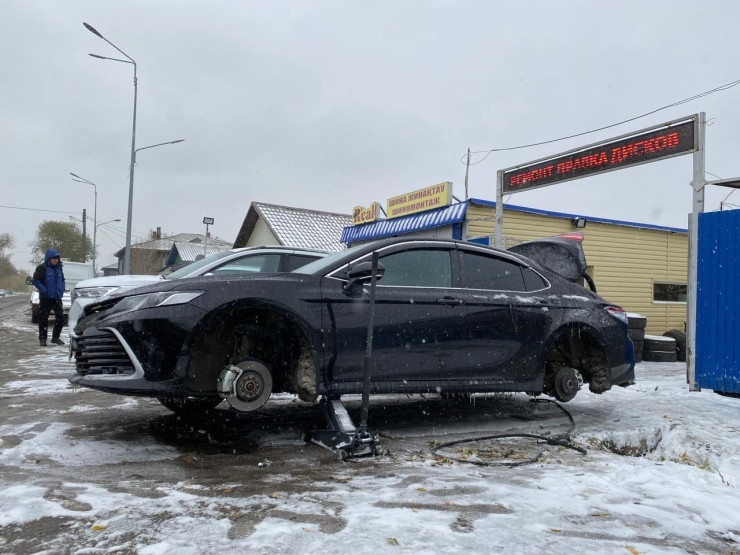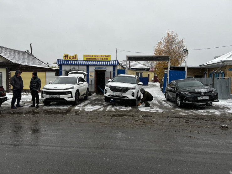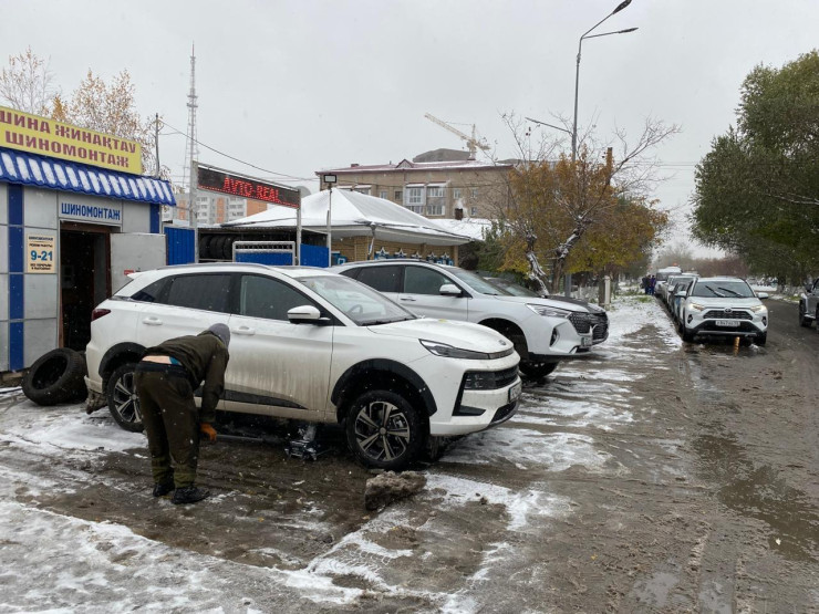 Из-за первого снега на шиномонтажках Петропавловска образовались огромные очереди, передает Tengri Auto.