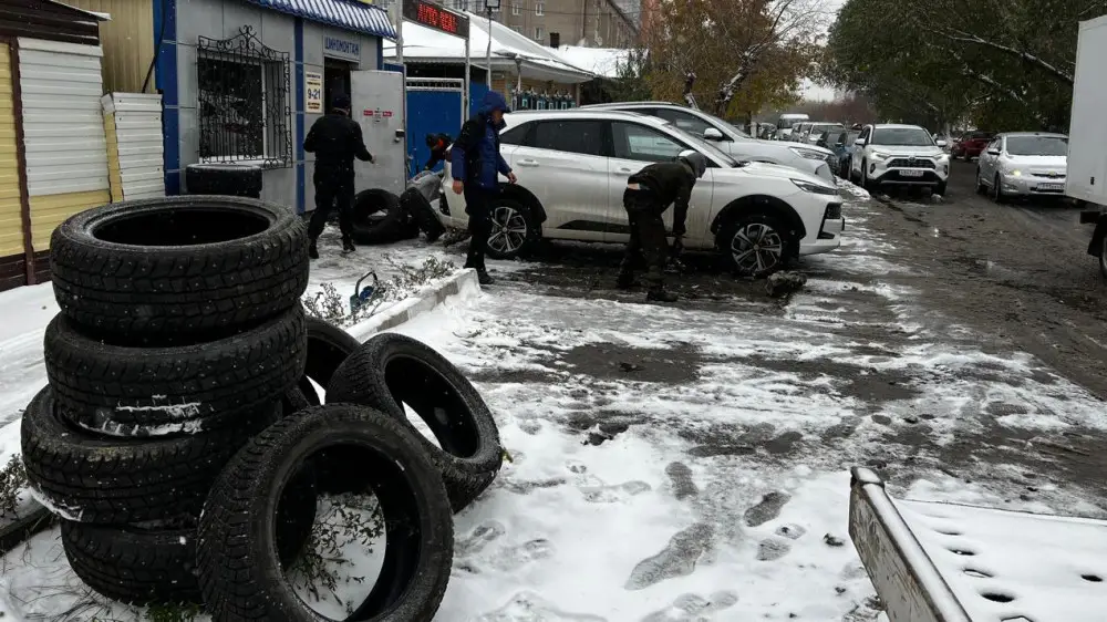Из-за первого снега на шиномонтажках Петропавловска образовались огромные очереди, передает Tengri Auto.
