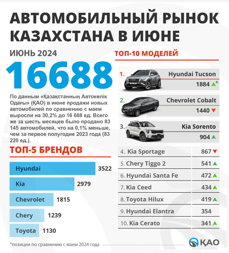 По данным "Казахстанского автомобильного союза", в июне 2024 года продажи новых автомобилей в Казахстане выросли на 30,2 процента по сравнению с маем, достигнув 16 688 единиц легковых и коммерческих машин, передает Tengri Auto.