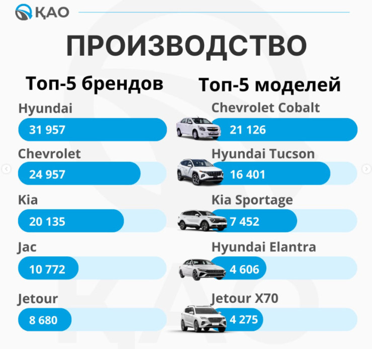По данным Казахстанского автомобильного союза, за первые десять месяцев 2024 года в стране произведено 107 128 единиц техники, включая 96 554 легковых автомобиля, 6 404 грузовых автомобиля и 2 207 автобусов. Общая стоимость производства составила 1,39 триллиона тенге.