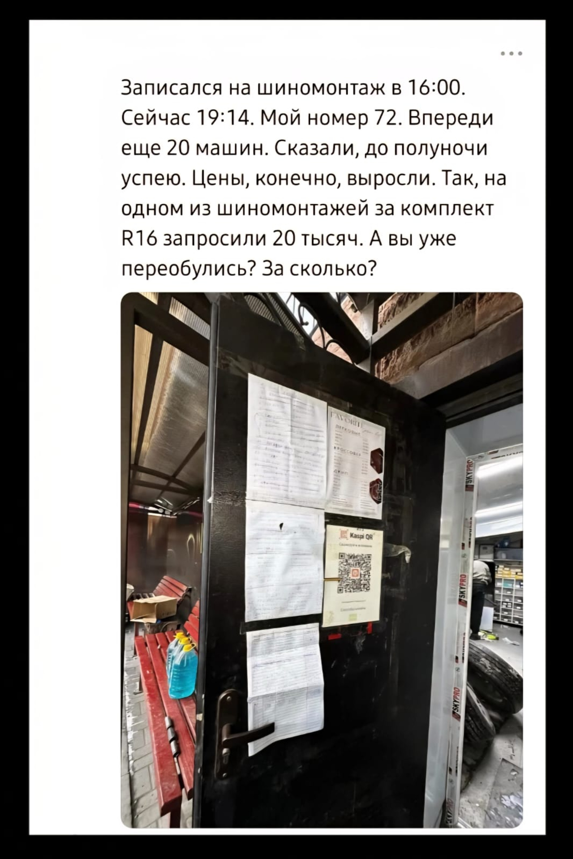 "Записался на шиномонтаж в 16:00. Сейчас 19:14. Мой номер 72. Впереди еще 20 машин. Сказали, до полуночи успею. Цены, конечно, выросли. На одном из шиномонтажей за комплект R16 запросили 20 тысяч. А вы уже переобулись? За сколько?"