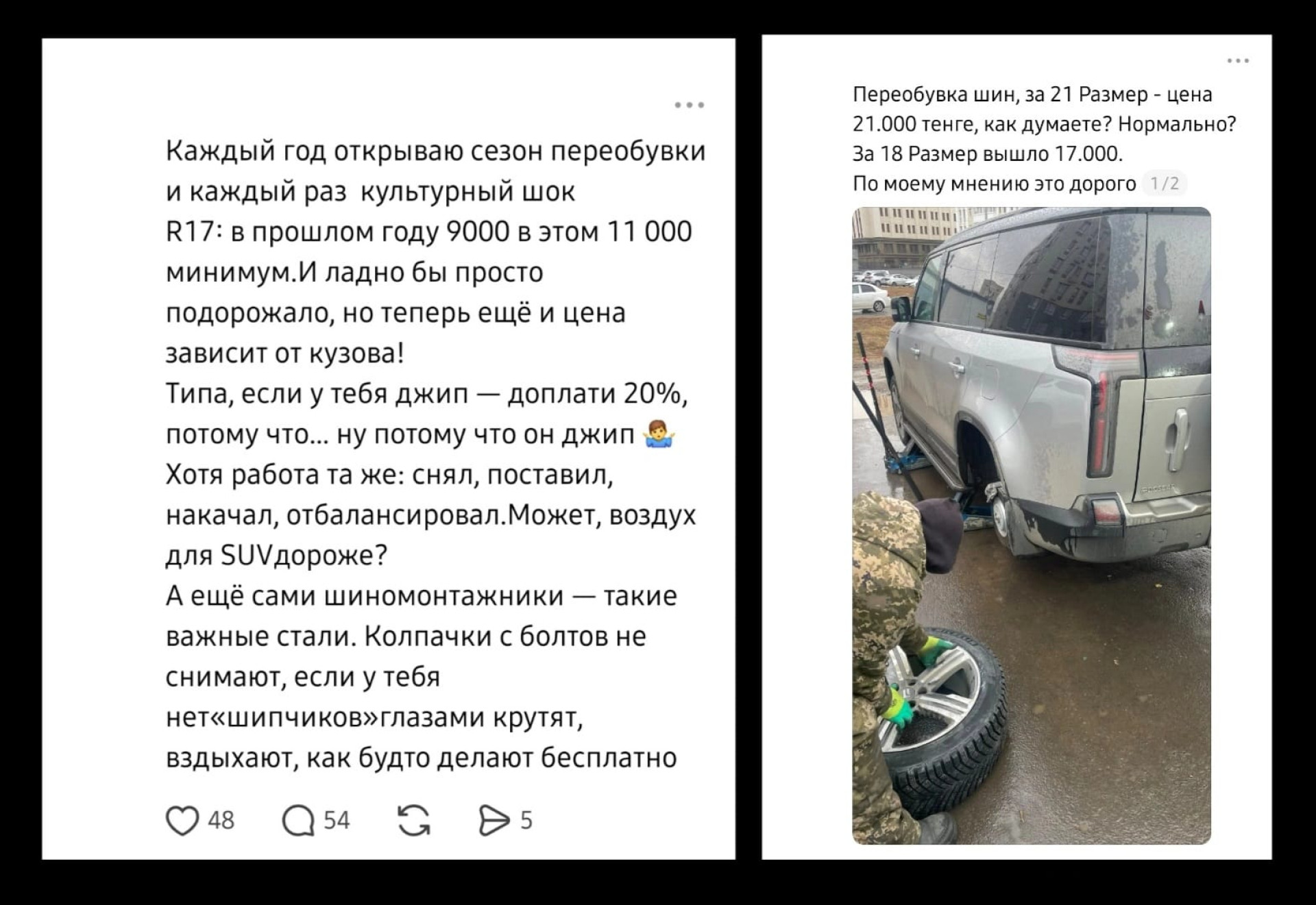 "Переобувка шин: за 21-й размер — 21 000 тенге. Как думаете, нормально? За 18-й размер вышло 17 000. По-моему, дорого"