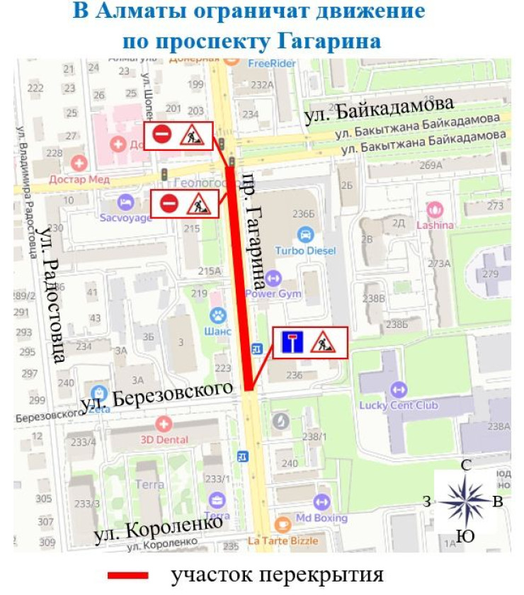 С 23:00 14 июня до 9:00 15 июня 2024 года движение автотранспорта в Бостандыкском районе Алматы будет перекрыто на проспекте Гагарина от улицы Березовского до улицы Байкадамова.