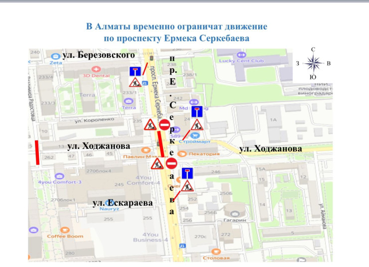 По данным акимата, с 6:00 10 августа до 10:00 13 августа будет перекрыто движение по проспекту Ермека Серкебаева в Бостандыкском районе от улицы Березовского до улицы Ескараева в обоих направлениях.
