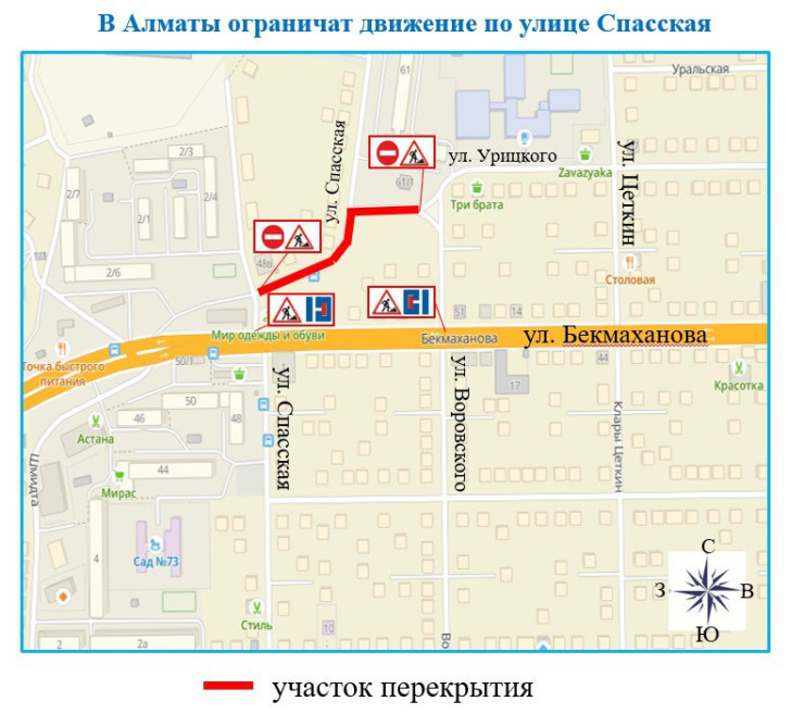 С 20 июня по 15 сентября улица Спасская будет закрыта для автомобильного движения на участке от улицы Бекмаханова до улицы Воровского с переходом на улицу Урицкого, передает Tengri Auto со ссылкой на "Алматинские тепловые сети".