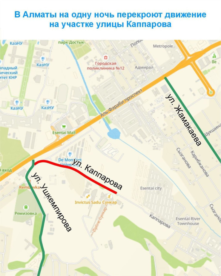 По данным акимата города, с 23:00 18 июля до 06:00 19 июля движение будет перекрыто на участке от улицы Ушкемпирова до комплекса лыжных трамплинов "Сункар".