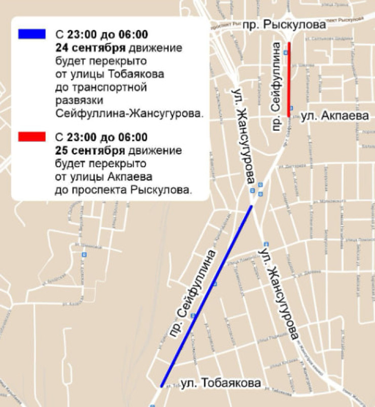 - с 23:00 до 06:00 25 сентября движение будет перекрыто от улицы Акпаева до проспекта Рыскулова. Объезд будет обеспечен по улицам Акпаева и Жансугурова.
